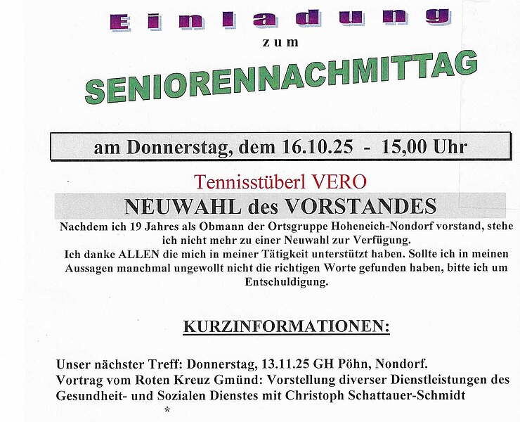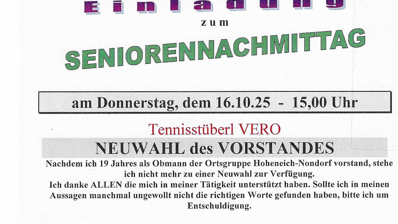 Unser nächster Seniorennachmittag findet am 16. 10. 2025 (Donnerstag) ab 15,00 Uhr im Tennisstüberl VERO statt.